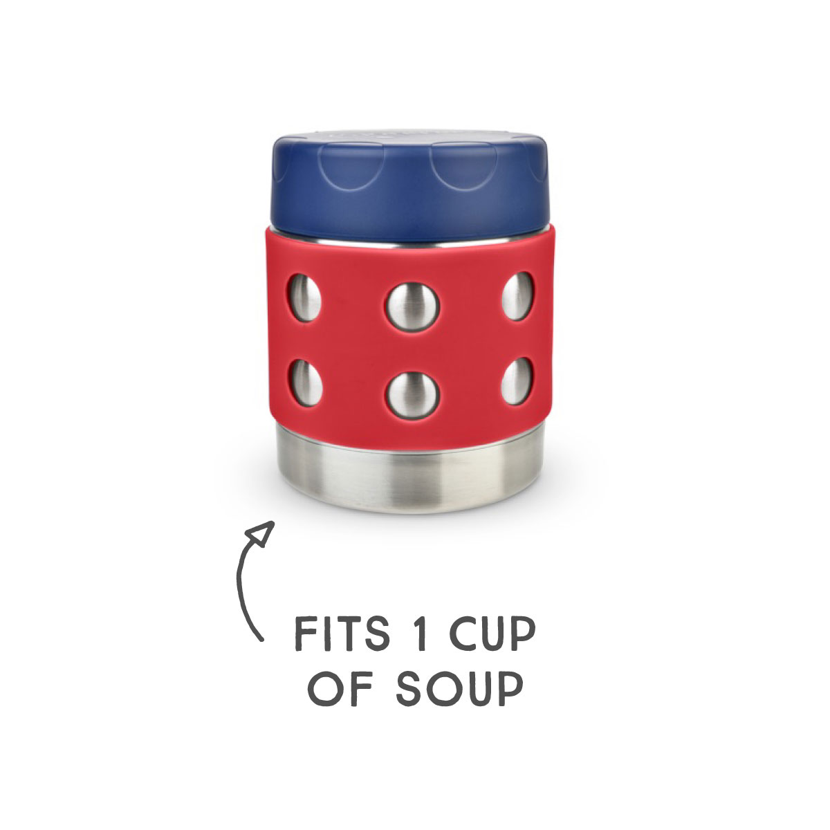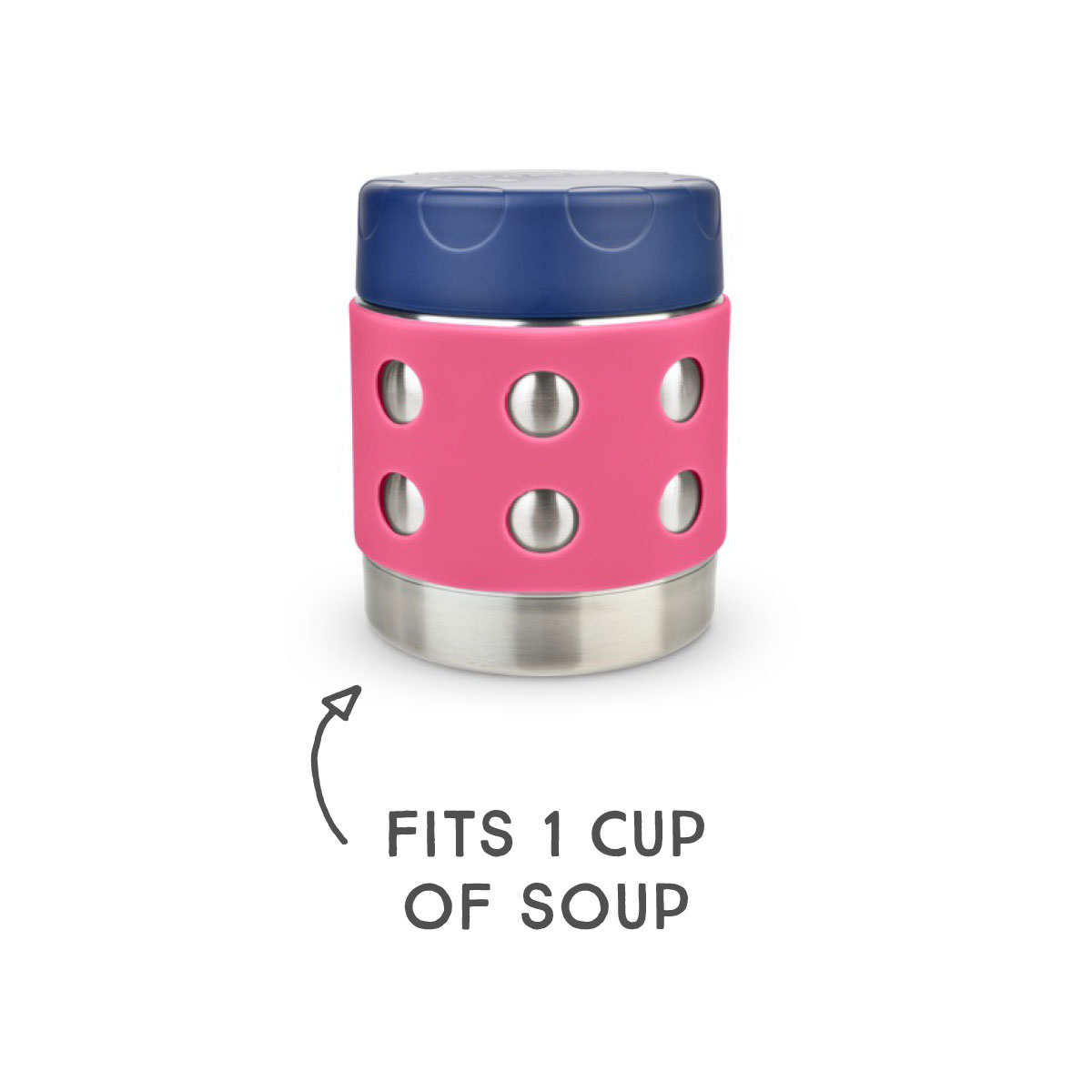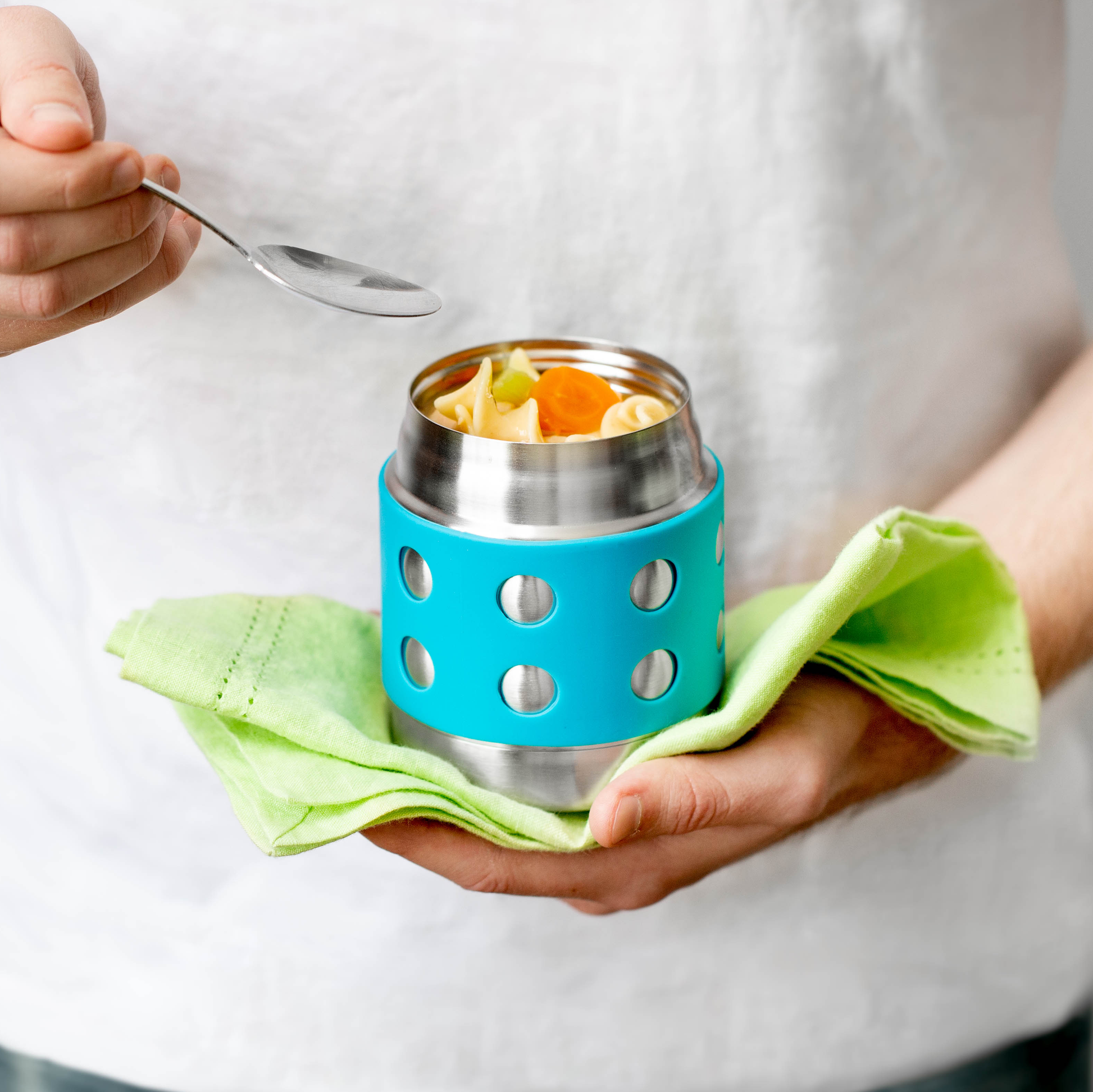 Triple insulated, this 8 oz. Thermal keeps 1 cup of your favorite soup or chili hot until lunchtime! A bright silicone sleeve adds a splash of color and its all-stainless interior means no plastic touches your food. Dishwasher safe.